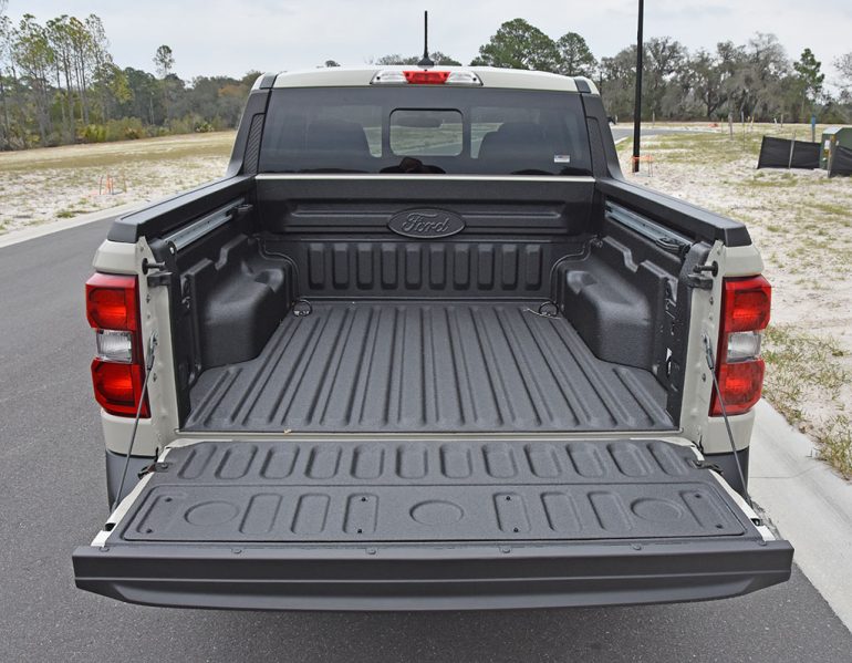 The punchy part of the Ford Maverick with the 2.0-liter turbocharged engine comes via 250 horsepower and 277 lb-ft of torque. That’s enough power to get the Maverick moving in a hurry, making it to 60 mph in just 5.9 seconds, which is considerably quicker than the hybrid Maverick that I drove a couple of years ago, taking 7.8 seconds to hit 60 mph. The ride quality of the Maverick is good, marginally better than the Bronco Sport, and handles rough roads with bumps and undulations well without the traditional jitters you get in larger trucks. The steering feel is good but void of feedback, but it tracks exactly where you point it without much play.