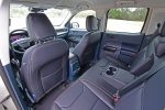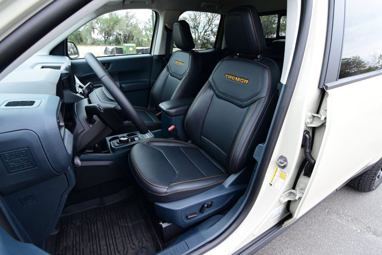 Being a compact truck, the Maverick still offers a good amount of space up front. It seems that some of the space is compromised in the back seats, where passengers are at the mercy of the front seat adjustments, which have a surprisingly long travel for adjustability. The back seating area is very short on legroom but accommodating if you flip the set bottoms up for just storage. The front heated seats in the Maverick Lariat Tremor are comfy despite the smaller visual perception of them, and they look the proper part for the Tremor package, having unique orange accents.