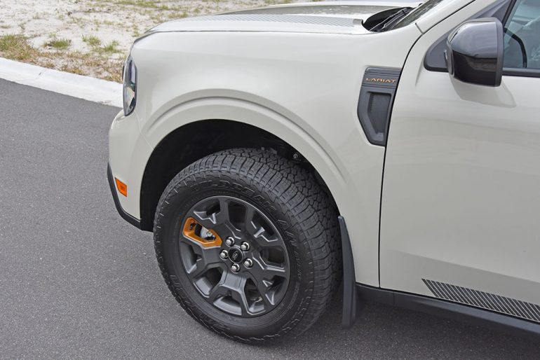 Having the new Tremor version of the Maverick, reserved for the XLT or Lariat trims only, elevate things a bit for the $2,995 package as you get unique 17-inch dark-painted wheels with orange pockets wrapped with all-terrain 30-inch Falken Wildpeak tires, an all-wheel-drive system with a torque-vectoring rear differential, underbody skid plates, off-road-tuned and elevated suspension, a full-size spare tire, and several off-road terrain drive modes, and a Trail Control feature that automatically holds a speed through rough terrain. Other bits that can be added to the Tremor package include $1,495 worth of exterior graphics and a grey-pained roof, which may not be worth the price of admission for some. If you opt not to get the exterior graphics, you still can easily recognize the Tremor version of the Maverick with its smoked LED headlights and taillights, and orange body accents.