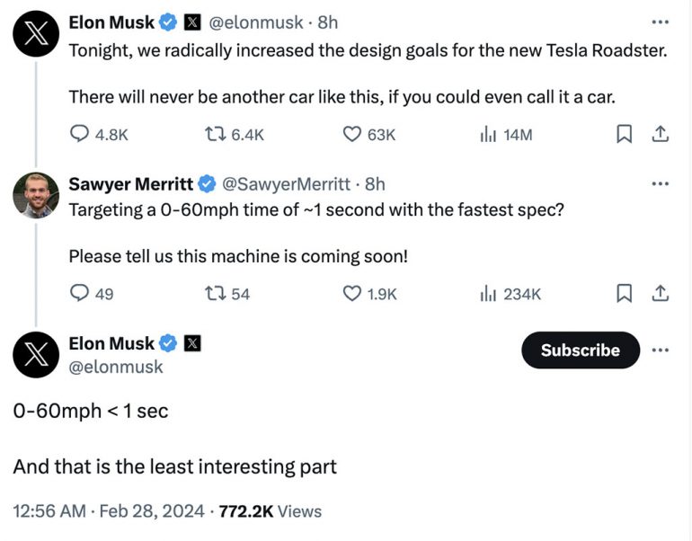 While Musk’s claims about the Roadster are undeniably ambitious, the Tesla community awaits eagerly for the promised reveal and eventual delivery, hoping that this time, the Roadster will indeed hit the roads in 2025, delivering on its groundbreaking performance promises. We just wonder how much it will cost for such unheard-of performance.