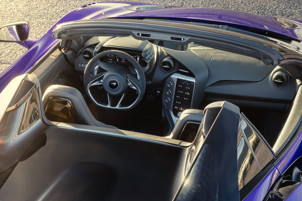 A supercar weighing less than 3,000 pounds is impressive. It makes you wonder if the vehicle is too light to stay planted. No worries, as the 750S rides around with an S on its chest, which equates to added capabilities from downforce and stability to stopping power and cornering ability. The Spider tips the scale at 2,923 pounds while the 750S Coupe arrives to the match at an astounding 2,815 pounds. The active rear wing has 20% more surface area than the outgoing 720S but is 3.5 pounds lighter. McLaren additionally saved 30.4 pounds on the new 10-spoke ultra-lightweight “Turbine” forged 19” rims. For the Spider, its carbon fiber and composite retractable hard top is only 108 pounds heavier than the Coupe but maintains the same level of rigidity and lowers in 11 seconds. My only gripe with the Spider is that it lacks the Coupe’s engine window to observe the V8, which is as impressive to view as the performance it offers.
