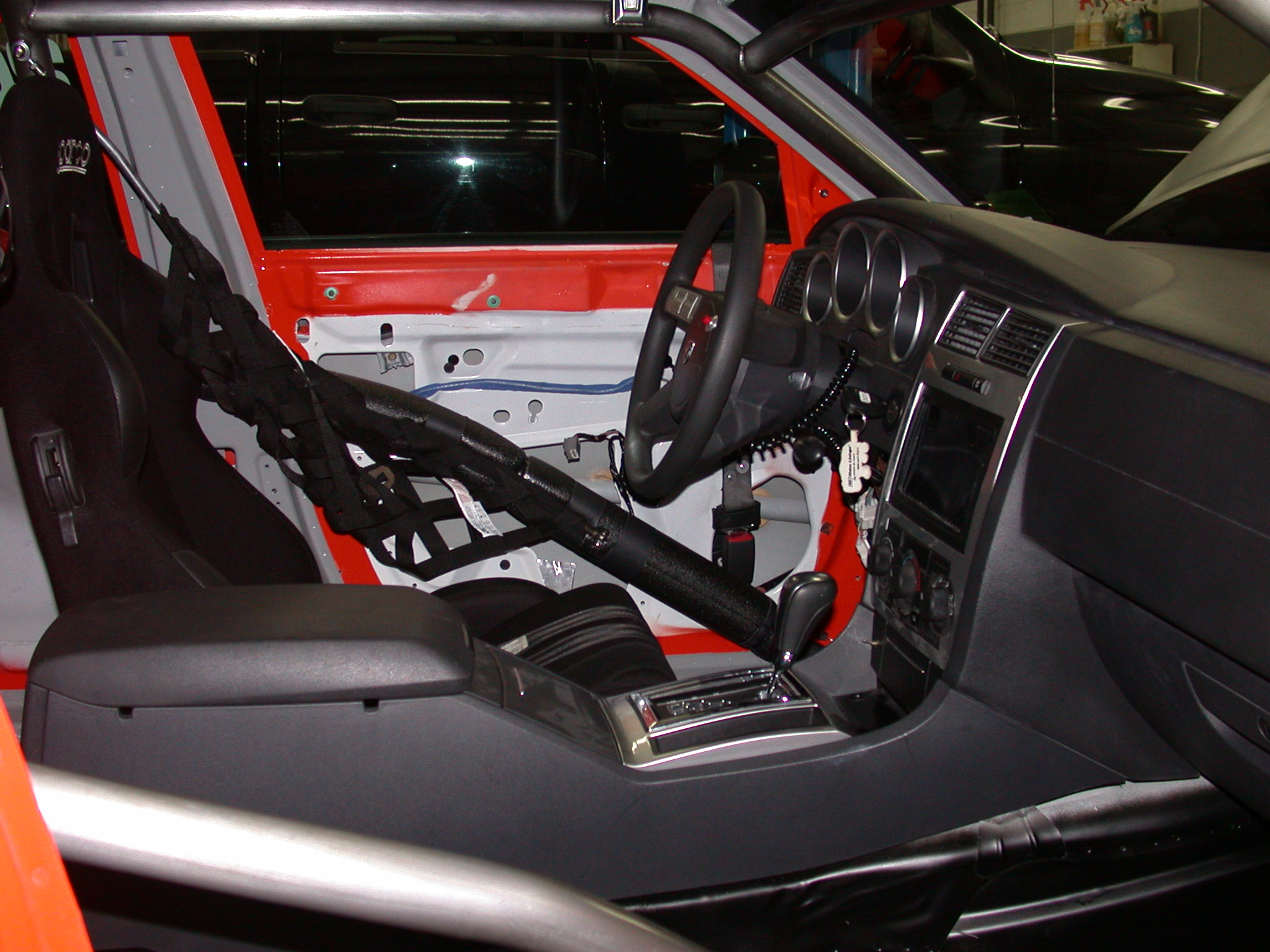 A GEN III 426 HEMI stroker motor is boosted by a Vortech centrifugal-style V-7 YSi-trim supercharger and is controlled through factory electronics, producing over 900 HP. The car retains modified factory components: transmission, IRS differential with 1000HP half shafts, suspension and shocks. A curb weight of 3,750 pounds was achieved by removing the interior.