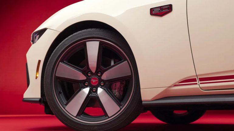 The 60th Anniversary package adds a distinct flair to the Mustang GT, distinguishing it from its standard counterpart. Three classic color options—Wimbledon White, Race Red, and Vapor Blue—are paired with 20-inch wheels featuring a Dark Gravity Gray finish. These five-spoke alloys boast Vermillion Red accents and aluminum center caps reminiscent of the ’65 Mustang, blending retro aesthetics with modern touches.