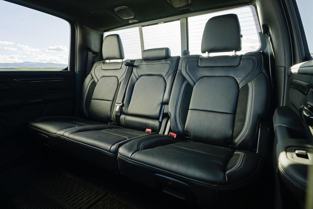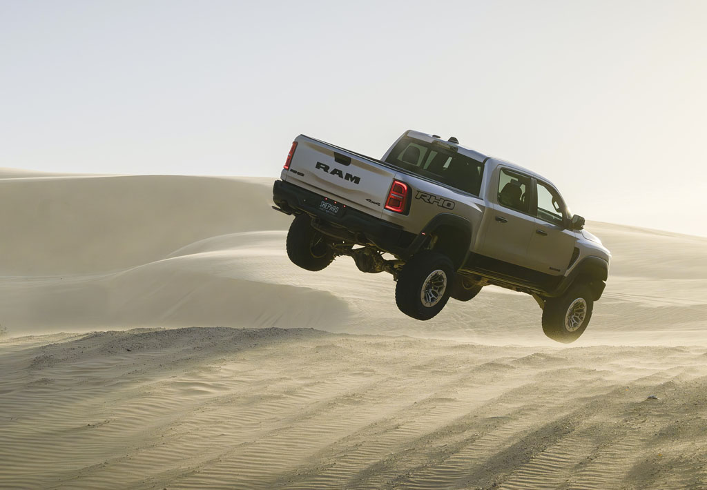 Beneath its imposing exterior, the RHO features Bilstein’s Black Hawk e2 adaptive performance shocks, fine-tuned for the truck’s weight distribution. Other performance enhancements include forged aluminum control arms, retuned spring rates, active performance damping, and a two-inch increase in ride height compared to the standard 1500 lineup. Additionally, the RHO boasts a robust drivetrain, featuring a BorgWarner transfer case, Dana rear axle, and upgraded frame components for increased durability and off-road capability.