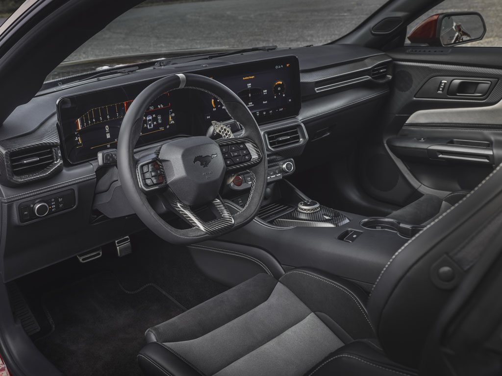 Turning our attention to the interior, the 2025 Mustang GTD retains its iconic Mustang charm while receiving a modern refresh. Familiar features like the 12.4-inch instrument screen and 13.2-inch infotainment display are elevated with updated graphics and a new Performance layout. The steering wheel receives a makeover, now sporting a sleek flat-bottom design wrapped in leather and Dinamica, accented with carbon fiber details. Noteworthy additions include buttons for adjusting suspension and exhaust settings, alongside the futuristic touch of 3D-printed titanium shift paddles. Meanwhile, the center console houses controls for Track Apps and the front axle lift system, catering to both performance and convenience.