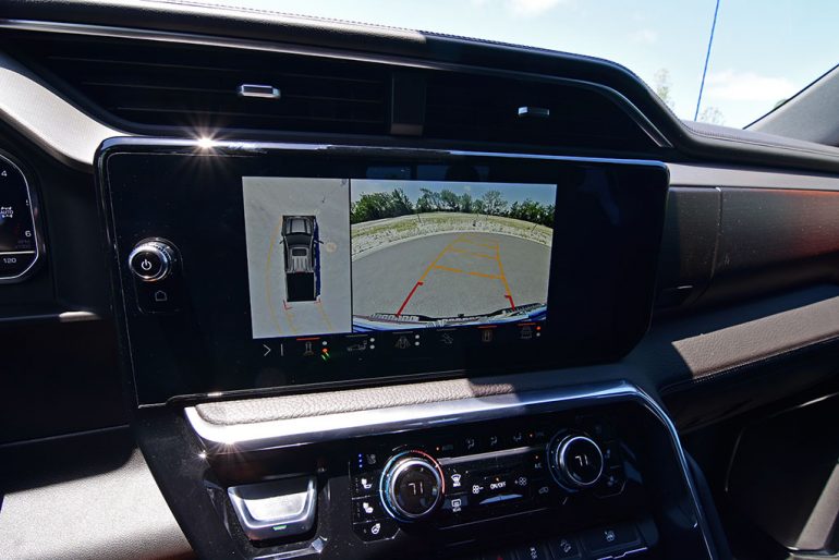 Acceleration is strong and confident, getting up to 60 mph in about 5.6 seconds as the 10-speed automatic transmission smoothly fires off shifts. As a relatively large truck, the Sierra 1500 Denali still feels like its size and doesn’t attempt to play any tricks to deceive you, which is why you have a trick 360-degree camera system that can be brought up at any time for ease of parking and maneuvering in tight spaces. The braking feel is somewhat soft until you really dig into the brake pedal, something that may be a little offsetting to some. However, braking can be strong and confident-inspiring after getting used to how the truck performs with or without towing a load. Speaking of towing, the GMC Sierra 1500 Denali can tow up to 8,900 pounds (13,000 pounds with max trailering package) and haul a payload of around 1,870 pounds. With the nearly countless trim levels and configurations, there remains to be something for everyone with varying payload and tow ratings throughout, mostly dependent on the engine choice (4 engine choices).