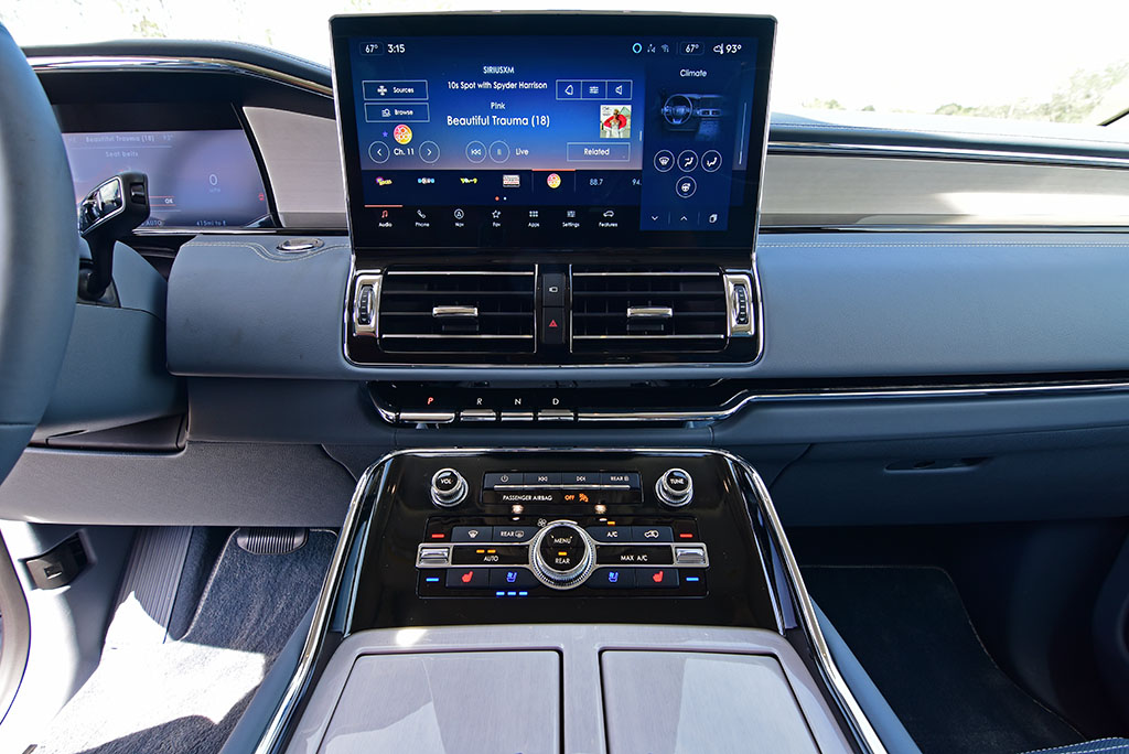 The latest Sync 4 infotainment system in the new Lincoln Navigator is a welcomed change from just two years ago, where you now have a larger 13.2-inch touchscreen that flows in the center down to the center climate vents. The new setup has many improvements and proves to be responsive for most inputs after an initial load process. The new system also makes better use of the screen real estate than the outgoing Sync 3 setup, with the option to display multiple functions at once, including having the climate functions displayed on the screen accessed by an array of physical buttons below. Even the wireless (or USB-connected) integration of Apple CarPlay and Android Auto can be configired to display on some of the screen or most of it. The tidiness of the center console is welcomed, as is the unique array of piano-styled transmission selector buttons.