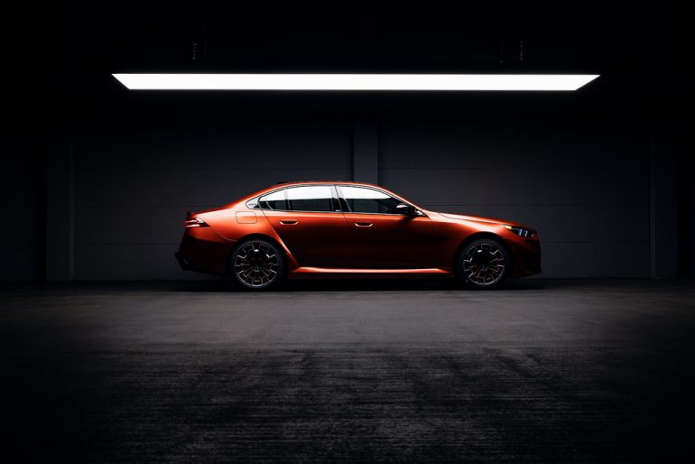 The 2025 BMW M5 Pebble Beach Concours d’Elegance #1/1 is distinguished by its exclusive BMW Individual Frozen Orange metallic paint. This color, inspired by the captivating orange hues of a Pebble Beach sunset, was scheduled to be discontinued prior to the start of M5 production. To ensure its uniqueness, the body of this M5 was painted weeks in advance, making it the only 2025 M5 in this striking shade. Complementing the vibrant exterior are hand-painted orange accents on the staggered M Dual-Spoke Bicolor wheels, which feature a 20-inch front and 21-inch rear configuration. These wheels, mounted on high-performance tires, surround massive M Carbon Ceramic brakes with calipers finished in Matte Gold, adding a touch of sophistication and performance.
